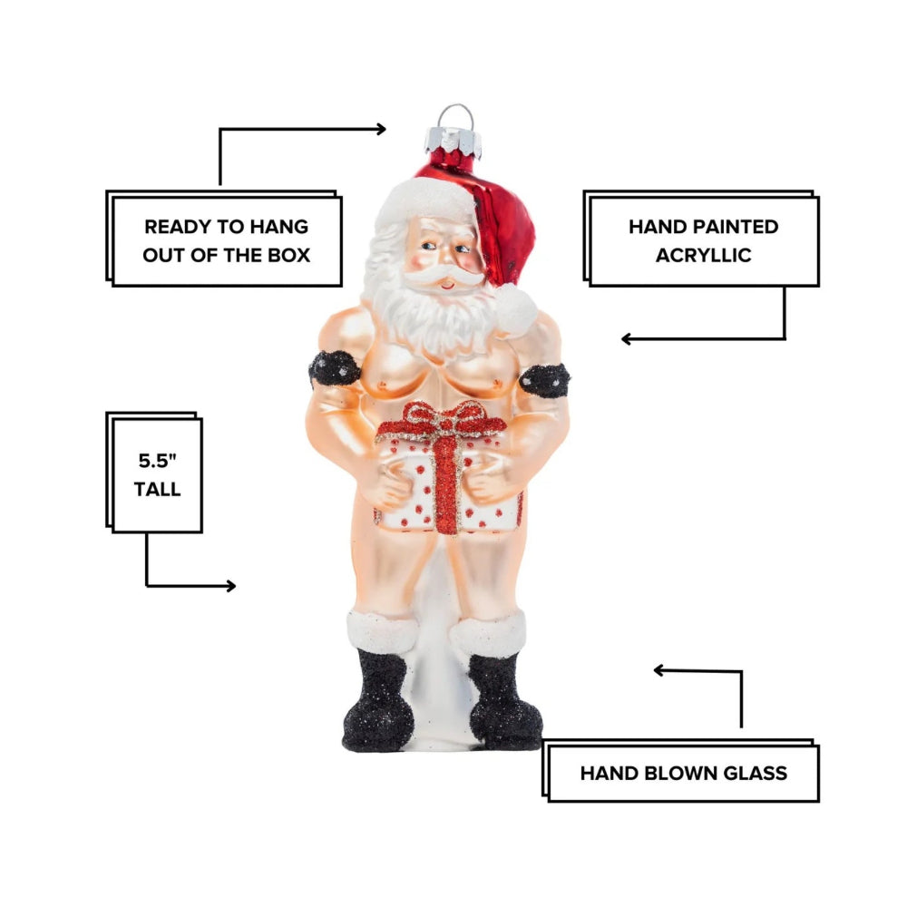 This jacked naked Santa has a special gift just for you! Hand blown glass, individually painted for a handsome decoration you'll enjoy for years to come.