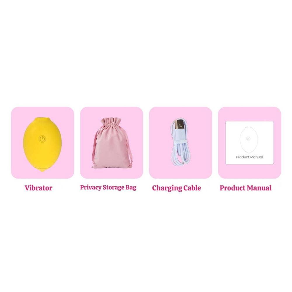 Includes Lemon sucking vibrator, charging cord, storage pouch, and instructions.