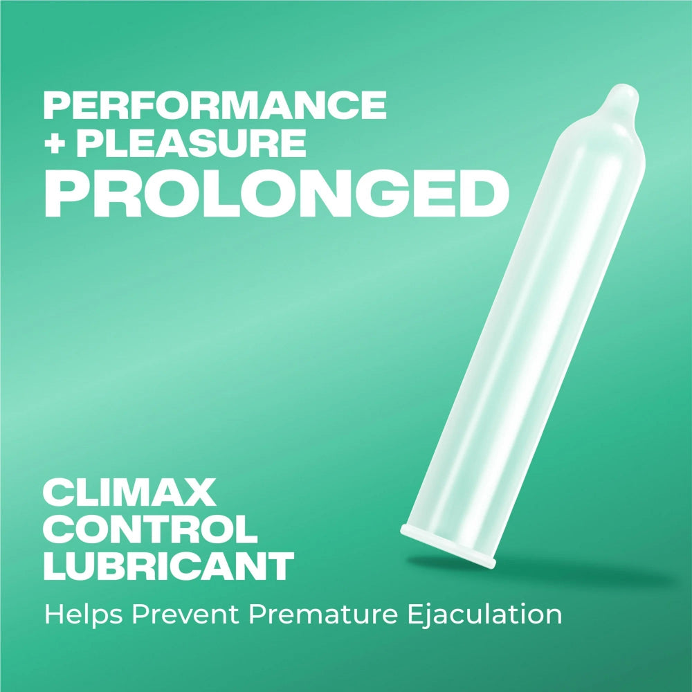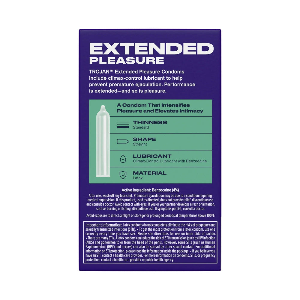 Enjoy longer lasting pleasure with Trojan Extended Climax Control, Desensitizing benzocaine lubricant inside keeps you going strong for longer! Desensitizing lubricant inside only numbs the wearer.